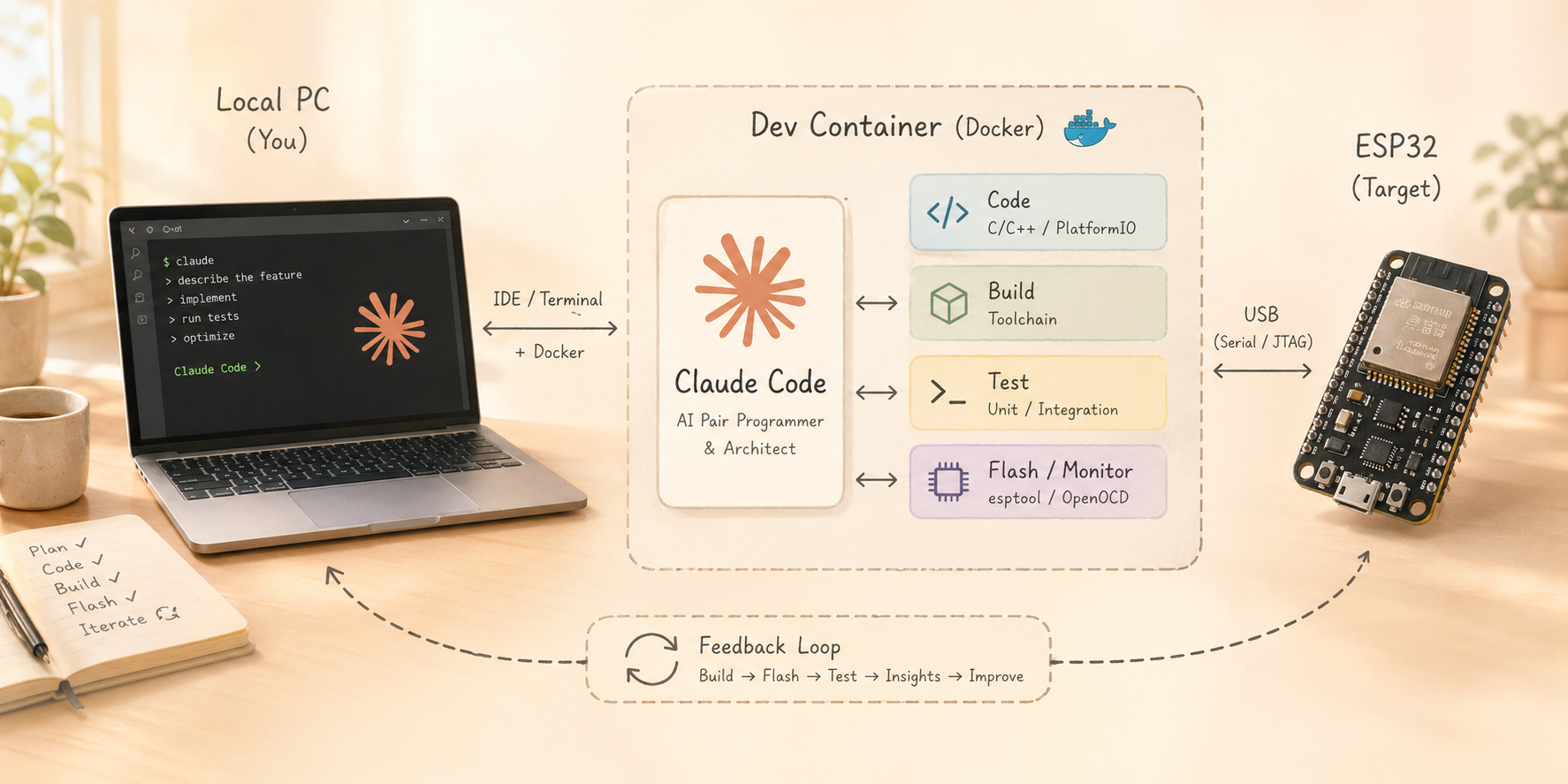 Claude Code doesn’t just write firmware — it flashes it to the ESP32 via USB, reads the serial debug log, and reacts to errors automatically. The loop looks like this: